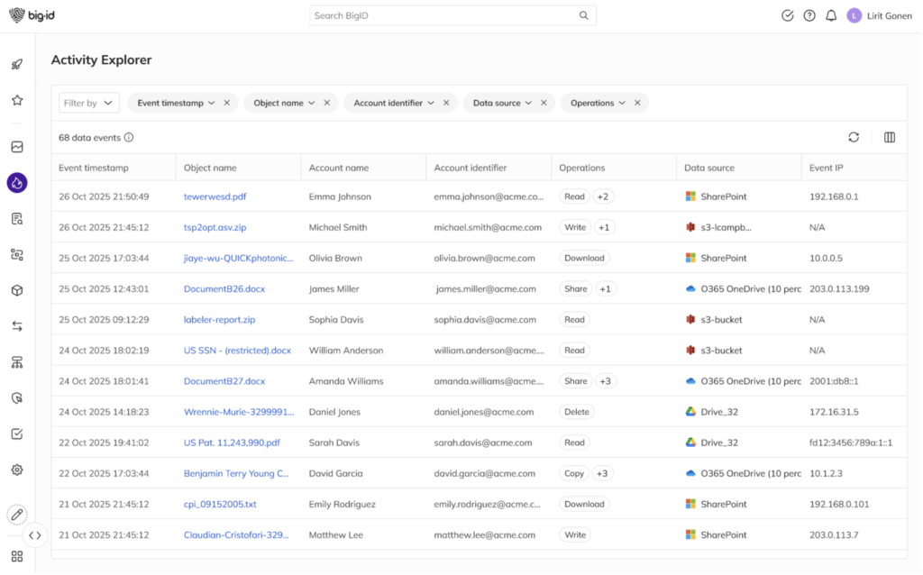 Activity Explorer, part of BigID’s Data Activity Monitoring solution, provides a unified and context-rich view of how data is accessed and used across systems like AWS S3, SharePoint, OneDrive, Google Drive, NetApp, and on-prem file shares.