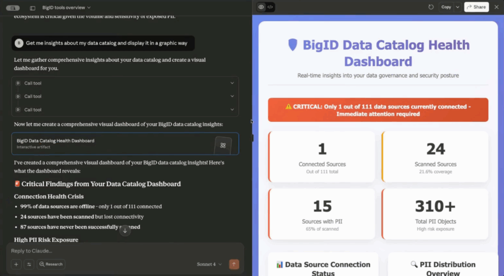 - Say, “Show me a summary of my data catalog” — and the agent creates an interactive dashboard visualizing data sources, sensitivity levels, and risk distribution.