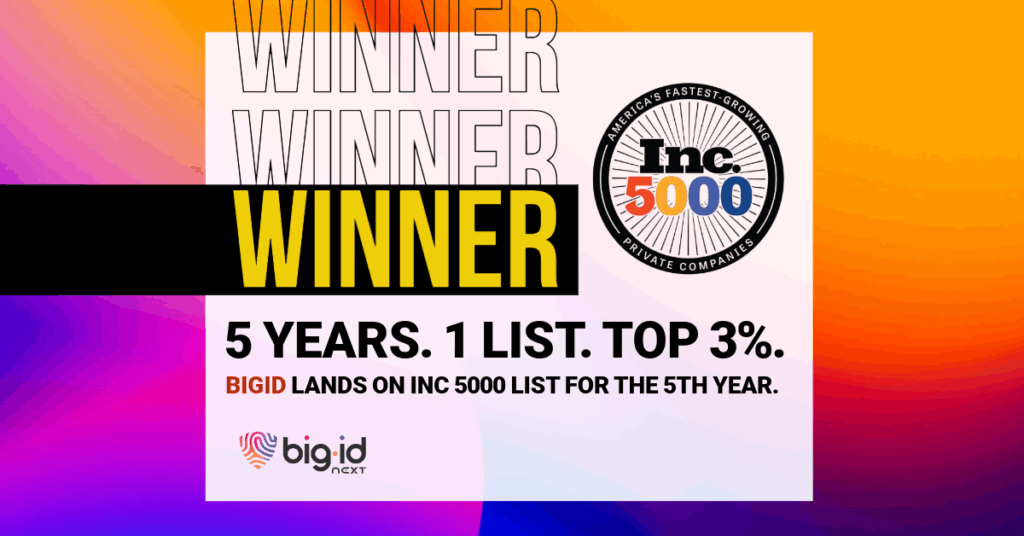 For the fifth year in a row, BigID has earned a spot on the Inc. 5000 list of America’s fastest-growing private companies. That kind of consistency is rare, with only 3% of all honorees making the list five times, and it’s proof of one thing: sustained growth built on relentless innovation.