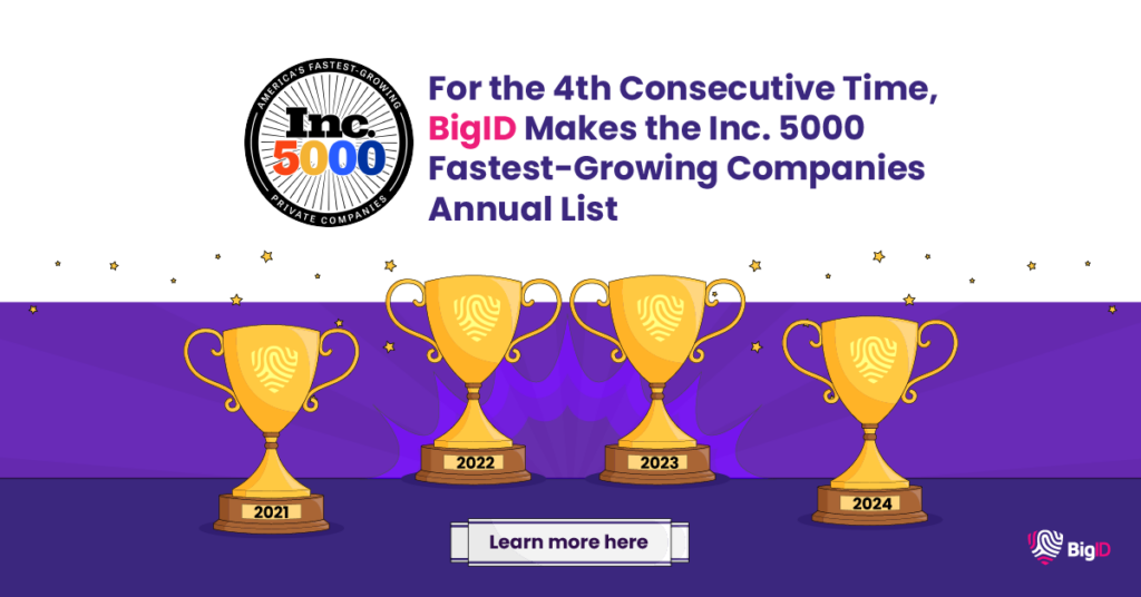 In an exciting milestone, we’re excited to share that BigID has once again earned a spot on the prestigious 2024 Inc. 5000 list, marking the fourth year in a row that BigID has been recognized as one of America’s fastest-growing independent businesses. This achievement not only underscores BigID’s rapid growth but also highlights our role as a leader in the fields of data security, privacy, and AI-driven data management.