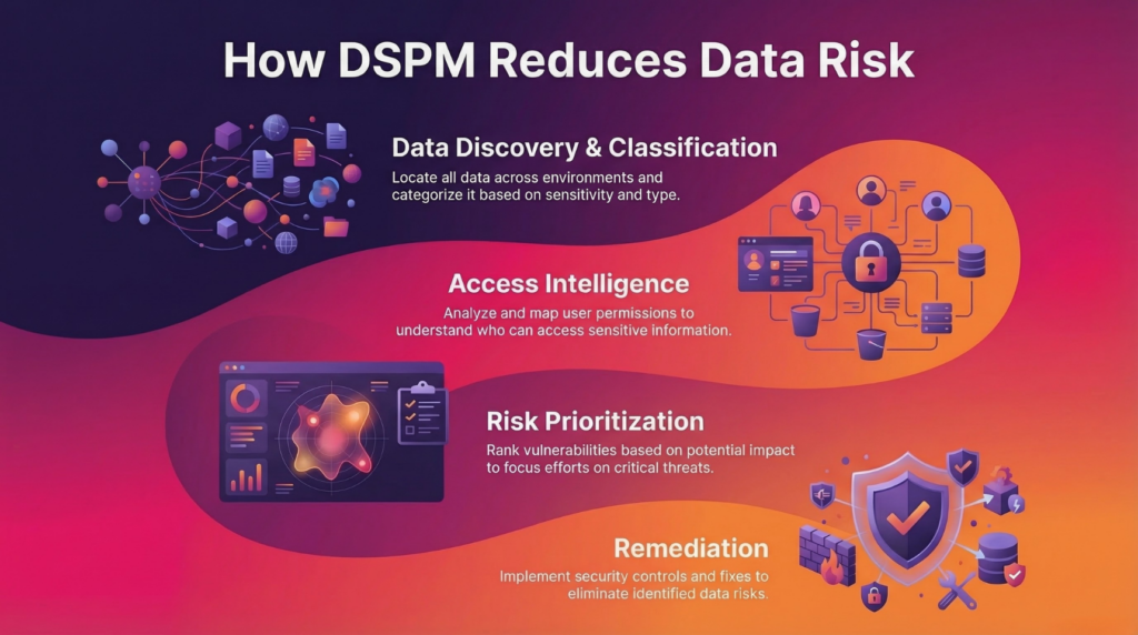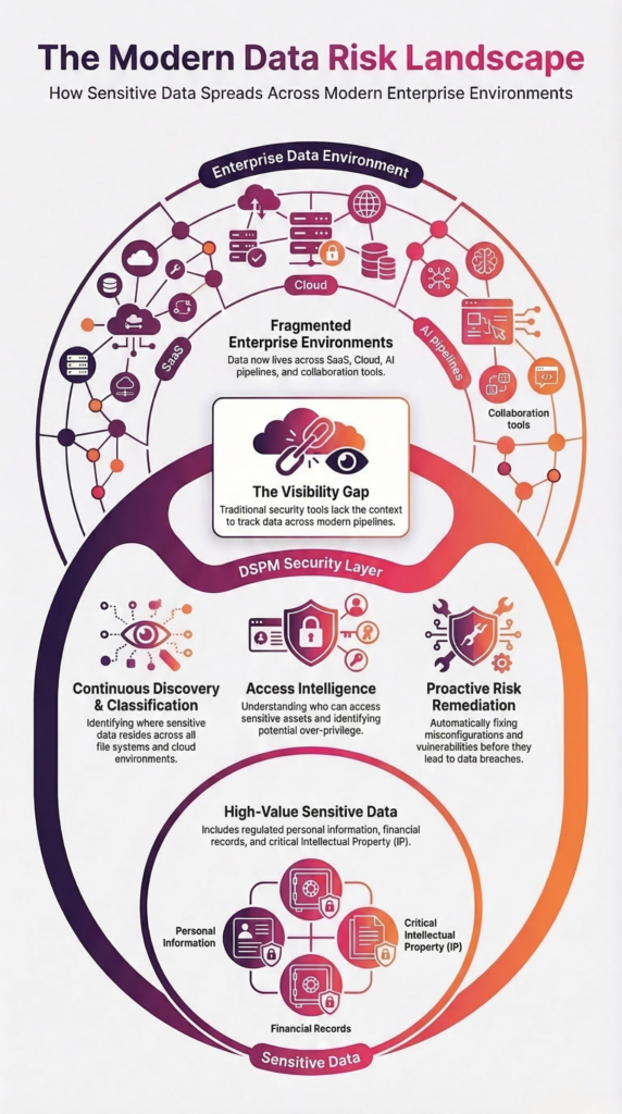 DSPM helps organizations discover, classify, and secure sensitive data across modern data environments. Instead of focusing only on infrastructure, DSPM focuses on the data itself.
