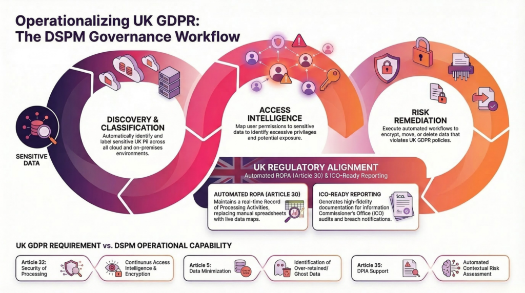 DSPM helps organizations discover personal data, classify regulated information, analyze access risk, and reduce exposure. This supports key UK GDPR requirements such as accountability, data minimization, and security of processing.
