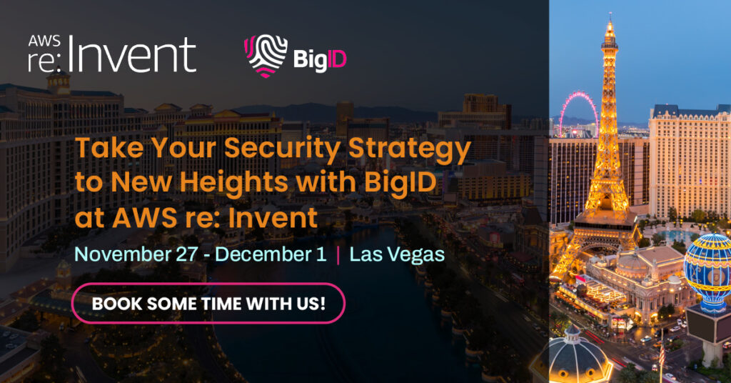 BigID is excited to be back at AWS re:Invent this year! We invite you to drop by our booth on the expo floor (booth #163) – it’s the perfect opportunity to learn more about how we can help you discover, manage, protect, and get more value out of your data across AWS.
