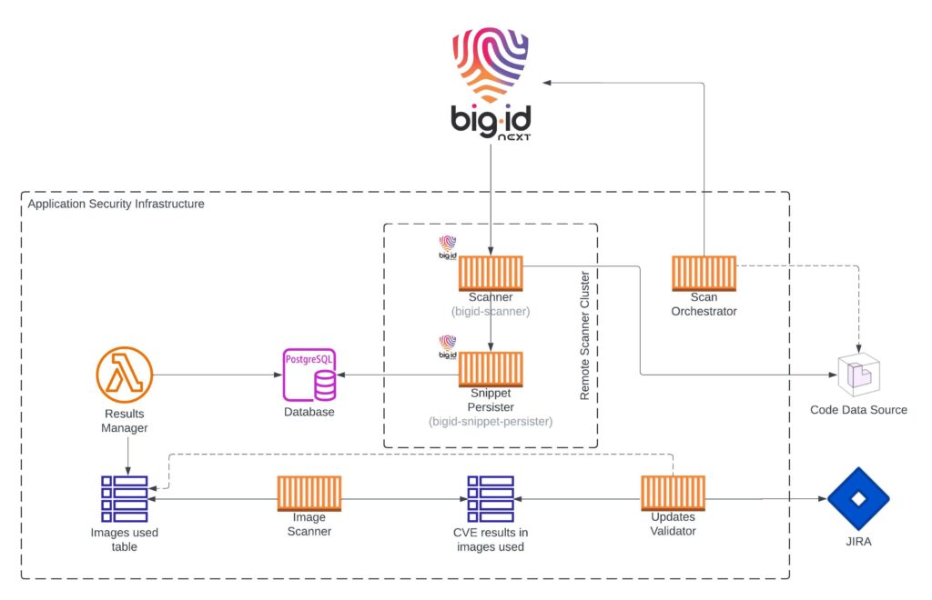 - The initial trigger is a notification sent to the Scan Orchestrator stating that a new version has been released. This will kick-off the orchestration of the BigID data sources and scans, starting with the creation of a data source dedicated to the Code Data Source (this data source is BigID’s Version Control System) tag corresponding to this new version and the respective scan. This orchestration will ensure that at the end of the scan, the images referenced in BigID’s code are stored in the Database linked to the Snippet Persister.