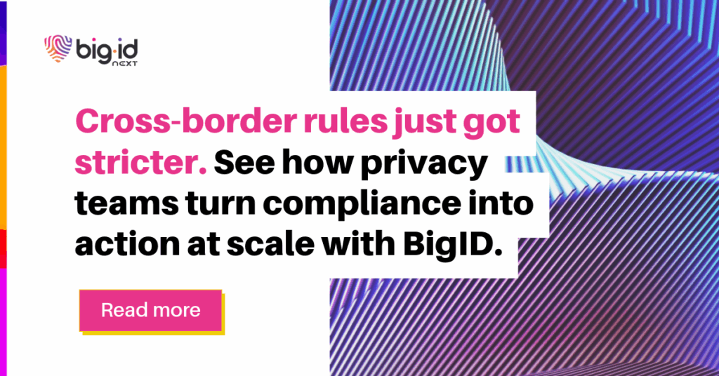 As cross-border data transfer rules tighten and sovereignty regulations evolve, privacy teams are on the hook to track where data lives, where it flows, and prove theyāre doing it right. BigID helps privacy leaders get ahead of these rising risks with automated, AI-driven data mapping, policy enforcement, and continuous visibility across their data landscape.