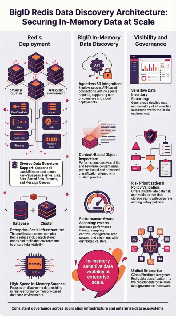 BigID stellt über eine agentenlose Integration eine sichere Verbindung zu Redis her, um Schlüssel-Wert-Strukturen und unterstützte Datentypen zu scannen. Es analysiert die im Speicher abgelegten Datenwerte, um personenbezogene, regulierte und geschützte Informationen zu identifizieren.