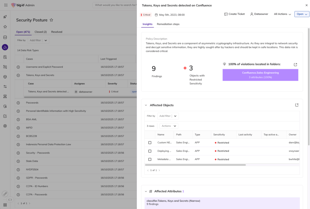 Upon confirmed exposure, BigID triggers automated alerts, policy-based actions, and remediación natively and through integrations across the security stack. Delete, move, anonymize, encrypt, and more.