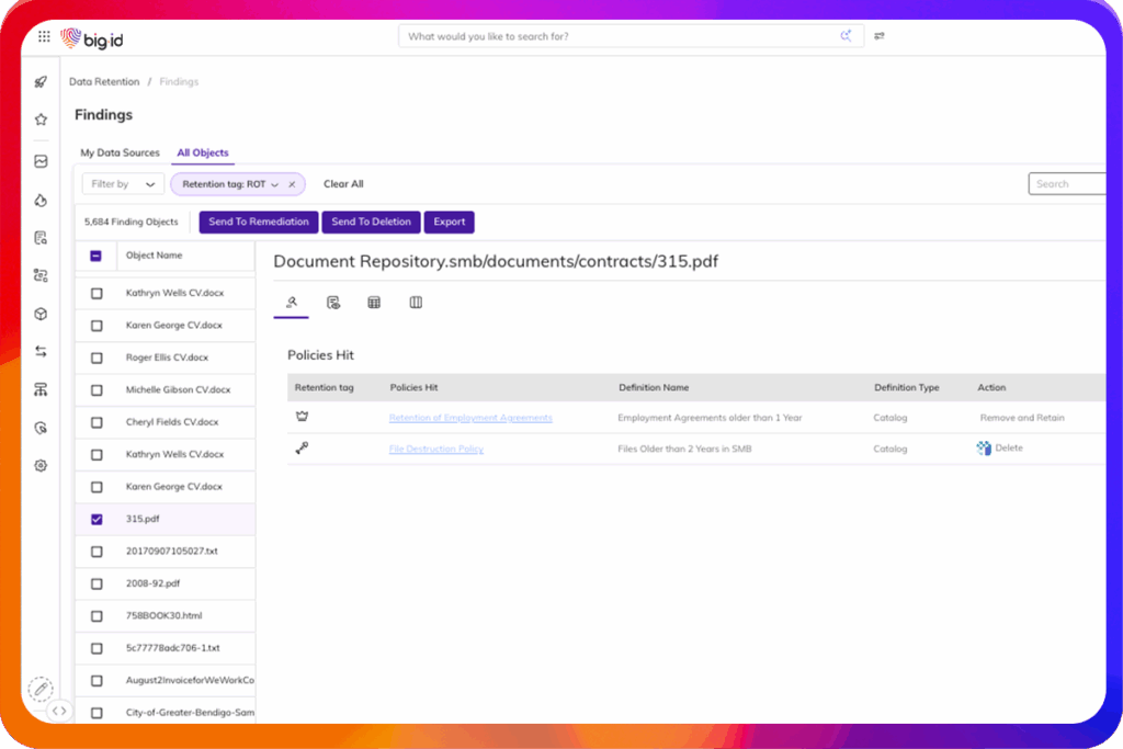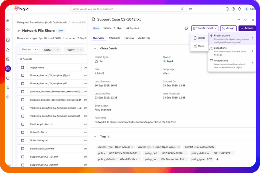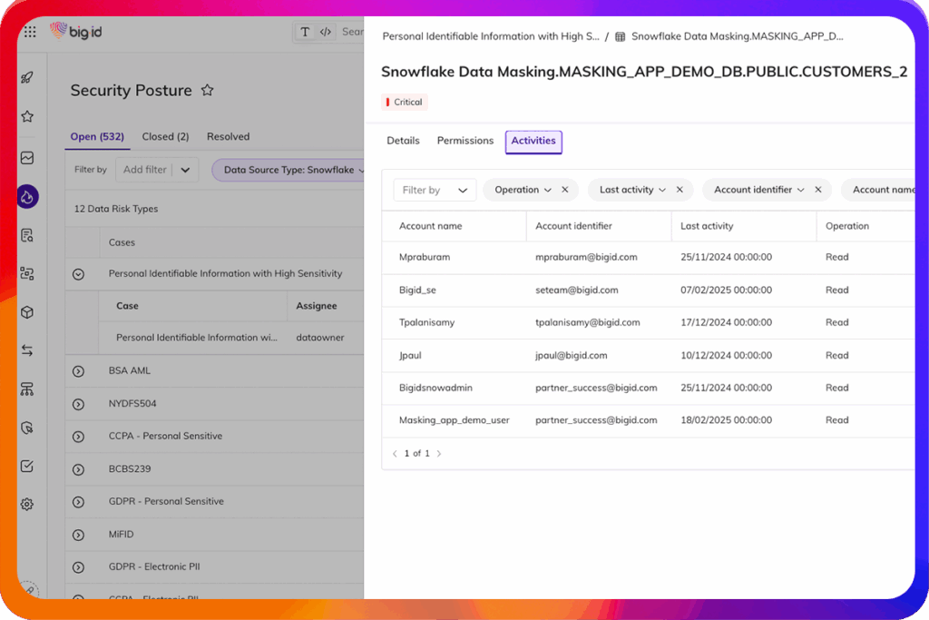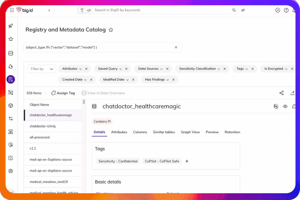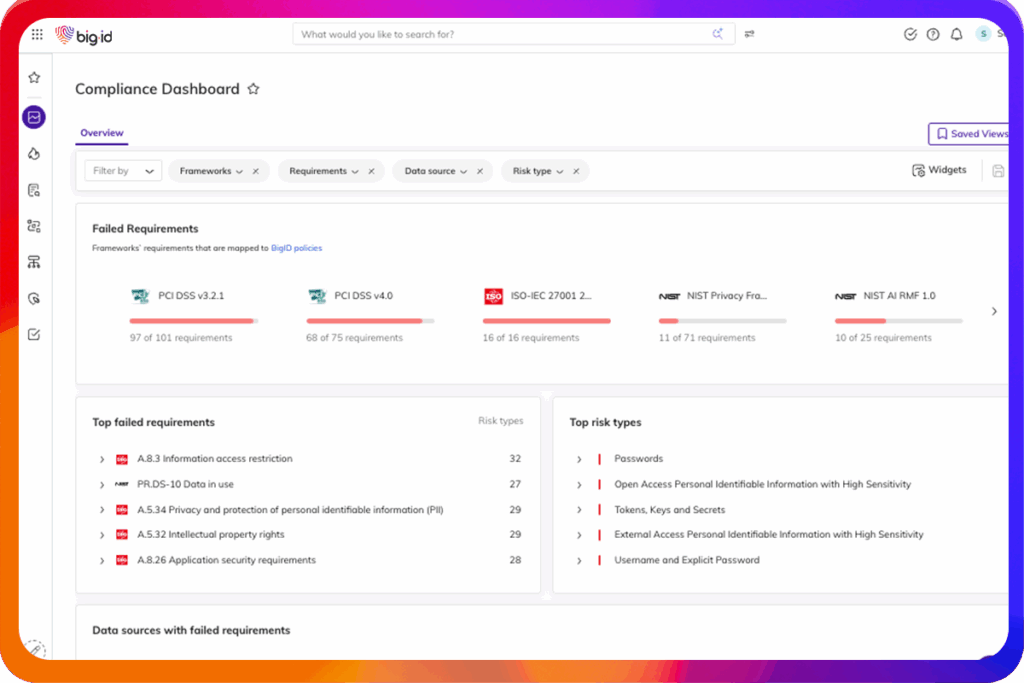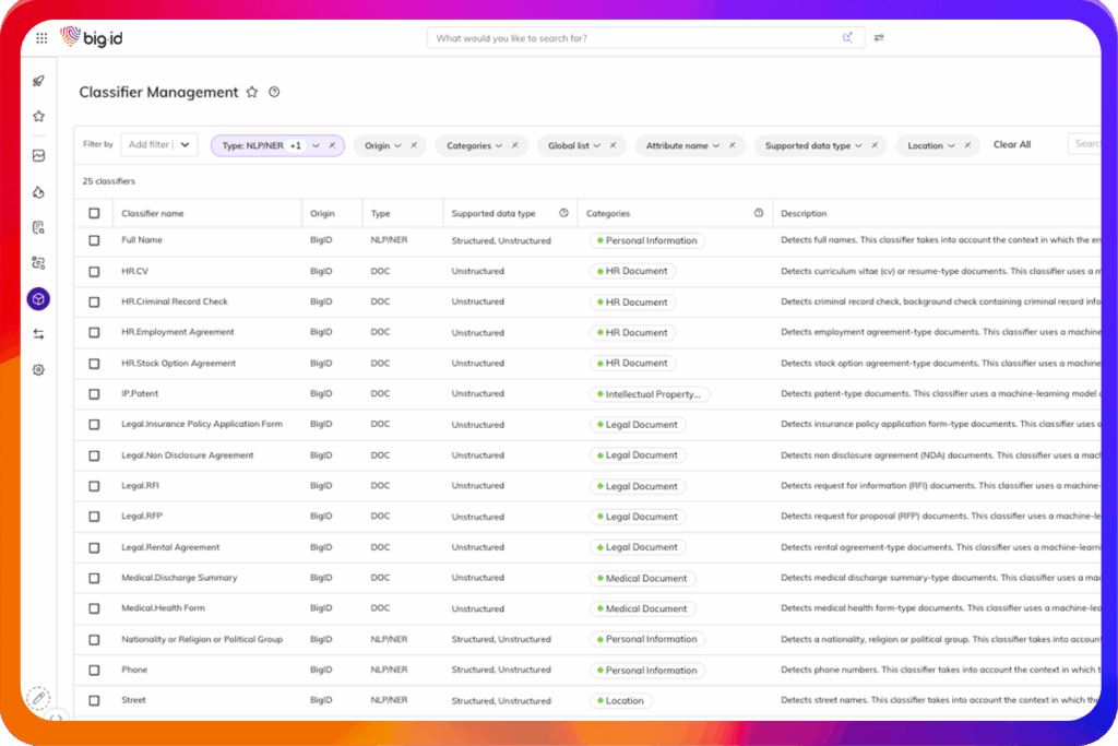 Más cobertura de datos e IA que cualquier otra plataforma DSPM, DLP o de acceso a datos. Desde entornos multicloud hasta SaaS, locales y de desarrollo, BigID detecta automáticamente datos e IA donde otros no pueden, ofreciendo la visión más completa y continua de su entorno.