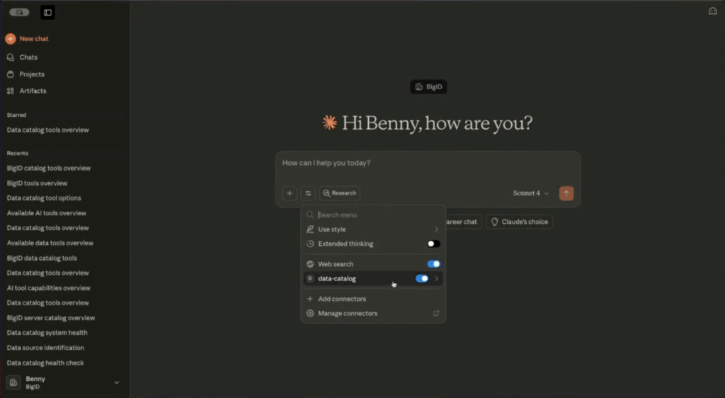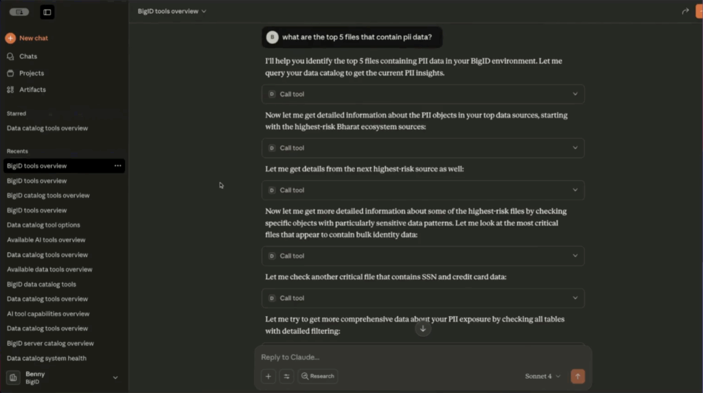 BigID’s MCP Server for Data Catalog connects AI agents and copilots like Claude directly to your enterprise data — securely, contextually, and intelligently. Bring trusted data intelligence into AI workflows with governed access, deep context, and the ability to take action safely.
