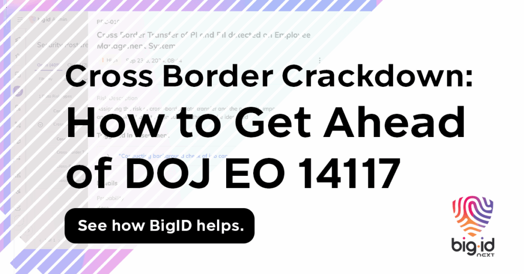 O BigID permite As organizações podem detectar, controlar e demonstrar conformidade com a Ordem Executiva 14117. As equipes de privacidade, jurídicas e de segurança podem agir rapidamente para se manterem à frente das regulamentações e dos riscos.